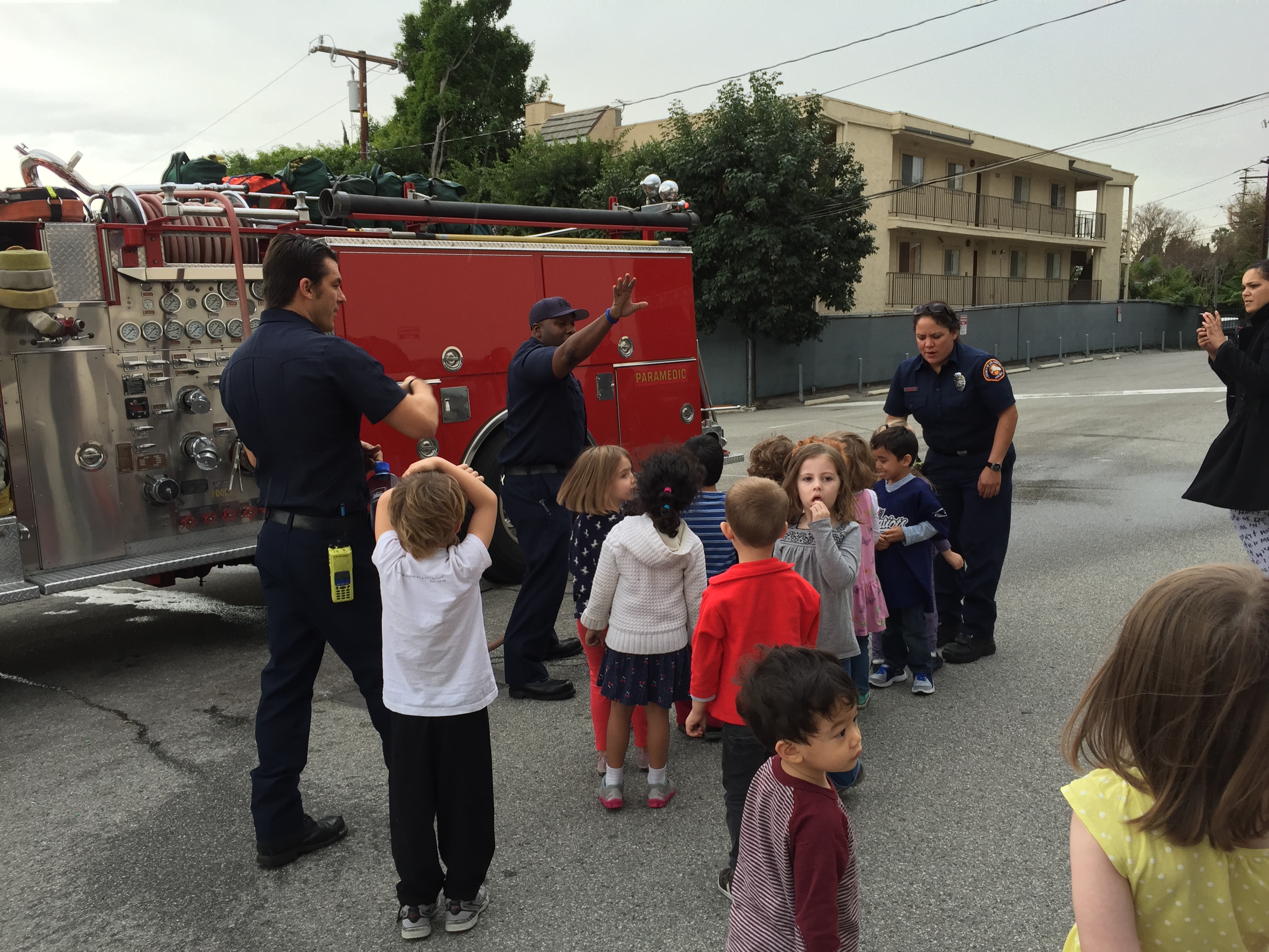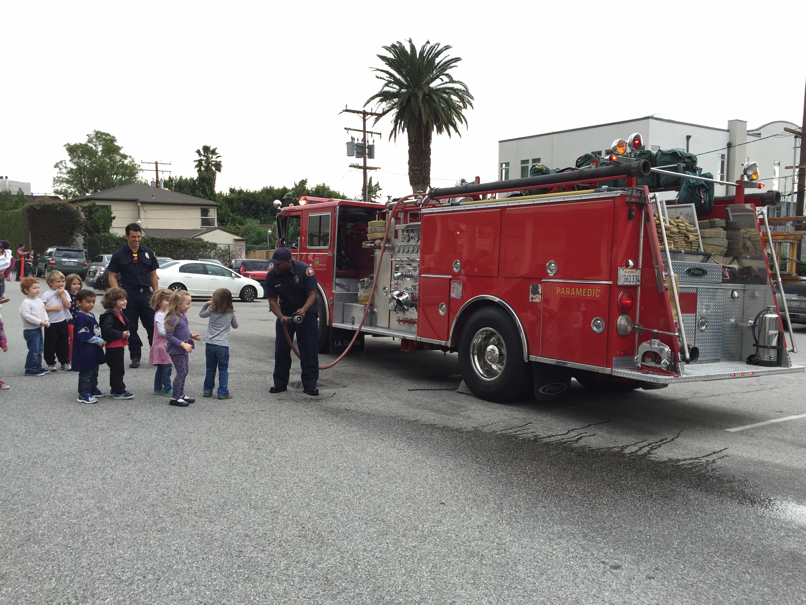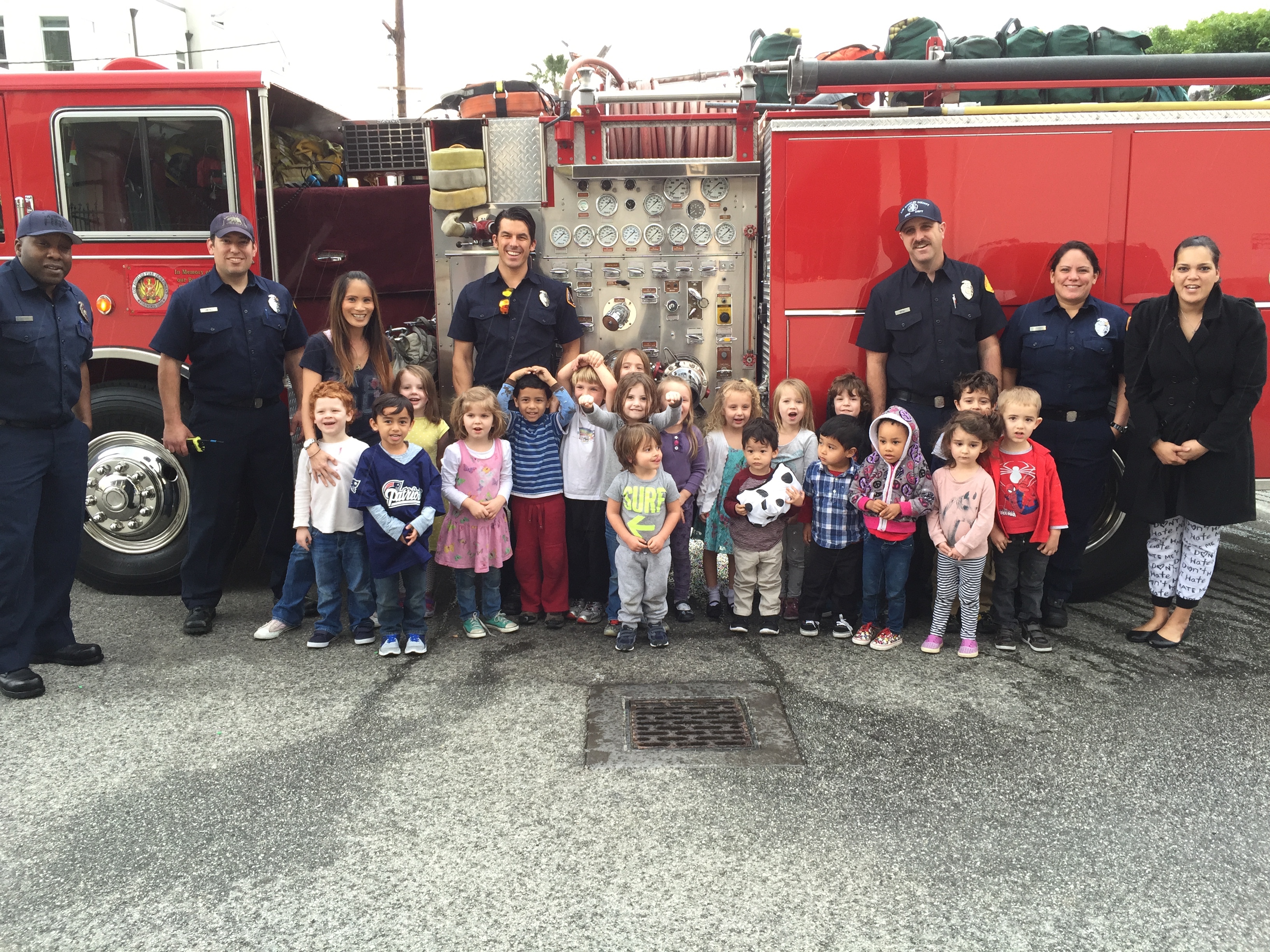 This past Friday, January 30th the local fire fighters of Station 8 stopped by to speak with the children about fire safety and to give the children a chance to see their fire truck up close and personal. The children learned a valuable lesson about fire prevention and safety!! Everyone had a wonderful learning experience and a grand time! A BIG thank you to the Los Angeles County Fire fighters out of Station 8 in West Hollywood for coming to visit our preschool!!!